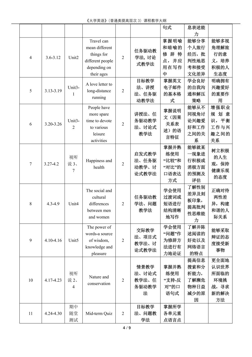 大学英语(普通类提高层次3)课程教学大纲(2022版)